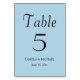 Guie seus convidados de recepção de casamento para a mesa com esta placa de número de tabela de estilo simples que apresenta letras pretas e estilizadas em um plano de fundo de cor azul-clara e tenra. Design está em cada lado da placa. Edite seu cartão para alterar o número da tabela, os nomes dos casais de casamento e a data. Cartões de pedido separados para cada número de tabela.