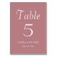 Guie seus convidados de recepção de casamento para a mesa com esta placa de número de tabela de estilo simples que contém uma inscrição branca e estilizada sobre um fundo de rosa empoeirado e tendencioso. Design está em cada lado da placa. Edite seu cartão para alterar o número da tabela, os nomes dos casais de casamento e a data. Cartões de pedido separados para cada número de tabela.