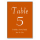 Guie seus convidados de recepção de casamento para a mesa com esta placa de número de tabela de estilo simples que apresenta letras brancas e estilizadas em um fundo cor de laranja torrado e torrado. Design está em cada lado da placa. Edite seu cartão para alterar o número da tabela, os nomes dos casais de casamento e a data. Cartões de pedido separados para cada número de tabela.