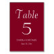 Guie seus convidados de recepção de casamento para a mesa com esta placa de número de tabela de estilo simples que contém uma inscrição branca e estilizada em um fundo de cor vermelho de cranberry e de tendências. Design está em cada lado da placa. Edite seu cartão para alterar o número da tabela, os nomes dos casais de casamento e a data. Cartões de pedido separados para cada número de tabela.