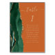 A borda esquerda desta elegante e moderna carta de números da mesa de casamento apresenta uma esmeralda verde aquarela agate borda com falsa brilho dourado. A palavra "tabela" aparece em um guião de escrita manuscrita dourada sobre um fundo laranja queimado. Adicione os nomes dos convidados que estão atribuídos a cada tabela.