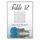 Essas placas de números de tabela facilitarão para seus convidados encontrar seus assentos na sua recepção de casamento. Eles apresentam um design simples, mas elegante, com caligrafia por script e um solteiro azul-céu, turquesa ou rosa de cor azul-azure, deitado do lado com ondas e reflexões de ondulação. O cartão inclui um quadro de lugares com 10 nomes. Há também espaço para os nomes dos casais e a data do casamento.