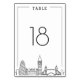 Uma tabela de casamento única para um casamento acontecendo na linda cidade de Londres. Ele apresenta um número de tabela simplificado descendo sobre uma versão estilizada do horizonte único da famosa cidade.