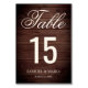 Cartões de números de tabela elegantes com script cursivo contra um fundo de madeira de celeiro rústico.