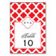 Cartões de números de mesas de casamento com padrão branco e vermelho. Padrão de quatrefoil vermelho em um fundo branco.