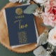 Um design de passaporte de casamento de destino azul marinho com bússola dourada e elementos viagem. Este design é ideal para todos os casamentos de Primavera, Verão, outono e inverno. Um marinho de viagem de casamento elegante, azul e ouro, com um passaporte. Uma design de mesa de casamento de destino moderno com elementos elegantes. Os convites de casamento e outros artigos de papelaria também estão disponíveis.