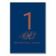 Este elegante número de tabela tem um monograma interligado na fonte de script em tons de cobre e texto de cobre em um fundo azul.
