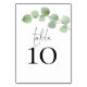 Casamento De Sábio Moderno Eucalyptus. A mesa é definida em um script de estilo de escrita manual e seu número de tabela abaixo com uma folhagem elegante de aquarela na parte superior, à direita. Personalize facilmente o número. O mesmo design está do outro lado e será atualizado simultaneamente à medida que você fizer a alteração no número.