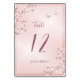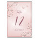 Esta elegante carta de número da mesa de casamento mostra flores de cereja rosa e poeirenta bonito em um fundo de marisco de seda.