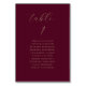 Esta elegante e moderna carta de números da mesa de casamento mostra a palavra "mesa" em um guião de escrita colorida dourada sobre um fundo vermelho escuro. Adicione os nomes dos convidados que estão atribuídos a cada mesa na fonte sans serif.