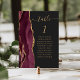A borda esquerda desta elegante e moderna placa de número da mesa de casamento apresenta uma borda vermelha e borrifada de cor d'água, aparada com falsa brilho dourado. A palavra "mesa" aparece em um guião de escrita manuscrita dourada sobre fundo preto. Adicione os nomes dos seus convidados que estão atribuídos a cada mesa.