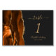 A borda esquerda desta elegante e moderna placa de número da mesa de casamento apresenta uma borda de cor de água laranja queimada, aparada com falsa brilho dourado. O texto personalizável combina manuscrito dourado e fontes itálicas e em prato em um fundo preto escuro.