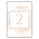 Este design apresenta um salto de elegante cor d'água de pêssego. Esse simples design tira proveito do traçado natural do pincel de abertura de aquarela para enfatizar o texto. O número da tabela é enquadrado em preto e branco. A combinação da cor de pêssego com as cores preto e branco cria um estilo sofisticado, moderno e chic. Elegante design da mesa de casamento com elementos modernos. A configuração moderna da tipografia lhe dá um estilo distinto. Os convites de casamento e outros artigos de papelaria também estão disponíveis. Personalize o número e adquira cada número mesa individualmente de acordo com quantos números de tabela você precisa.