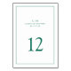 Simples número da mesa de casamento com um design elegante e eterno com seu monograma de duas letras, nomes, data e número da mesa cercavam uma borda fina. Todos os elementos de design estão em um tom de joia verde esmeralda sobre um fundo branco e podem ser alterados para qualquer cor desejada na ferramenta de edição de design. Um design limpo e clássico perfeito para um casal que quer um número de mesa estilo tradicional com um toque moderno. Adicione cada número de tabela ao carrinho individualmente.
