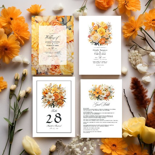 Cartão de número de mesa de casamento floral amarelo, laranja e marfim personalizável para suas especificações de evento.