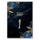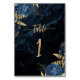 Este elegante cartão de número da mesa de casamento apresenta buquês florais azuis saltados com folha verde de folha de ouro em dois cantos, em uma imagem de fundo de um agate de cor azul marinho. O texto personalizável apresenta a palavra "mesa" e um número de tabela editável em letra dourada de escrita manual.