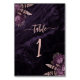 Esta elegante placa de número da mesa de casamento apresenta buquês florais roxos disparados com verde de folha de ouro rosa em dois cantos, em uma imagem de fundo de agate de cor d'água roxa. O texto personalizável apresenta a palavra "mesa" e um número de tabela editável em letra de escrita manual rosa rosa.