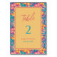 Um simples cartão de mesa de casamento com flores de verão divertidas e brilhantemente coloridas e folhas de palmeiras.