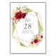 Cartões de número de mesa de casamento rosa e borgonha (marsala) com moldura geométrica de brilho dourado projetados para serem personalizados rápida e facilmente de acordo com os detalhes do seu evento.