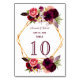 Uma carta de mesa elegante e romântica do estilo boêmico. Penas e rosas de cor aquosa, flores de cor rosa e burgundy. Um quadro fino em forma geométrica dourada sobre um fundo branco. Modelos para seus nomes, data e número da tabela. Letras coloridas brilhantes.