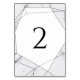 Este design apresenta padrões elegantes de mármore e geometria. Os padrões geométricos sobrepõem as linhas naturais simples do mármore. A combinação de cinzas, preto e branco cria um estilo sofisticado, moderno e chic. Elegante design da mesa de casamento com elementos modernos. A configuração moderna da tipografia lhe dá um estilo distinto. Os convites de casamento e outros artigos de papelaria também estão disponíveis. Personalize o número e adquira cada número mesa individualmente de acordo com quantos números de tabela você precisa.