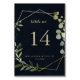 Este número da mesa de casamento da caligrafia verde-azul-de-ouro geométrico é perfeito para um casamento moderno. A design apresenta lindas folhas verdes pintadas manualmente em um fundo azul escuro, enfeitando uma armação geométrica dourada. Este é um número de tabela de dois lados. Adicione cada número de tabela de que você precisa ao seu carrinho individualmente.