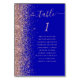 A borda esquerda desta elegante e moderna placa de número da mesa de casamento apresenta uma borda falsa de ouro rosa. A palavra "mesa" aparece em um guião branco rosa cor-de-rosa sobre um fundo azul real. Adicione os nomes dos seus convidados que estão atribuídos a cada mesa.