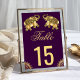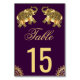 Cartão elegante de número de tabela com elefantes lindamente decorados contra um fundo roxo escuro.