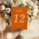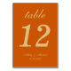 Um número de mesa de casamento simples para uma cor de casamento laranja queimada. É apenas texto amarelo dourado em um fundo laranja queimado. Tudo, exceto o número em si, é escrito em uma fonte caligráfica elegante.