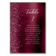 A borda esquerda desta elegante e moderna placa de número da mesa de casamento apresenta uma borda de burgundy faux glitter. A palavra "mesa" e o número da tabela aparecem em um guião branco de escrita manual em um fundo burgundy faux bruche metal. Adicione os nomes dos seus convidados que estão atribuídos a cada mesa.