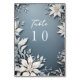 Números de mesa de casamento no inverno mágico, com um fundo azul gelado com flores e folhagem negras nítidas de inverno.