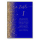 A borda esquerda desta elegante e moderna placa de número da mesa de casamento apresenta uma borda falsa dourada. A palavra "mesa" aparece em um guião branco de cor dourada sobre um fundo azul real. Adicione os nomes dos seus convidados que estão atribuídos a cada mesa.