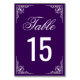 Cartões de número de mesa elegantes com uma borda ornamentada branca contra um fundo roxo escuro.