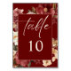 Este Elegante Borgonha e Cartaz NÚMERO NÚMERO da MESA floral vermelha apresenta seus detalhes de casamento em letras modernas, em um quadro de branco bege empoeirado com flores de aquarela e folhagem botânica em tons de terra inspirados no deserto, com burgundy, vermelho, marrom e marfim com cor de cobre quente.. Um cartão de decoração de mesa vermelho perfeito para o verão, primavera e casamentos no inverno.