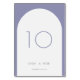 Simples número da mesa de casamento minimalista com um arco branco sobre um fundo roxo. Excelente para casamentos roxos mínimos. Desenhada por Patricia Alvarez.