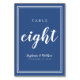 Esta design foi criada para comemorações íntimas de casamento. O design de número oito da tabela de casamento simples, minimalista e elegante apresenta um design contemporâneo com uma borda dupla de quadros em branco nítido sobre um fundo azul clássico. O design de chic oferece eterno, mas sofisticação moderna. Personalize a design de mesa de casamento com seus detalhes de casamento em letras brancas nítidas e roteiro. A parte traseira da placa é uma duplicata da parte frontal. Encomenda um para cada mesa com os números de tabela individuais. O Mesa ONE to TEN foi projetado individualmente e está disponível na minha loja InvitationSuites no Zazzle. Embora tenha criado especificamente a um local menor, se precisar de números adicionais, envie-nos um e-mail para InvitationSuites@gmail.com.