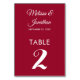 Cartão de número de mesa de casamento simples e elegante e minimalista, com um roteiro branco de na moda sobre um fundo vermelho. Facilmente personalizável com os nomes da noiva e do noivo, a data do casamento e o número da mesa. Para mais personalizações ou encomendas personalizadas, contacte-me livremente em acherryonthecake@hotmail.com (permita 1-2 dias úteis). Este cartão de Número de Tabela faz parte da coleção "Orquídeas Delicadas - Suínos Vermelhos Crimson" com muitos itens de coordenação para criar um pacote de casamento único.