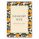 This wedding tabletop sign features a cheerful citrus theme with vibrant orange fruits and dark green leaves arranged in a playful border around a central beige panel. The design uses clean, flat colors and a symmetrical layout to create an inviting atmosphere, perfect for guiding guests to the dessert bar. Bold serif typography highlights the phrase "Dessert Bar" while a friendly message encourages guests to indulge. Ideal for summer or citrus-themed events, this sign combines visual appeal with clear communication, making it a delightful addition to any celebration.