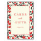 This wedding tabletop sign features a cheerful and playful design with a central cream-colored square bordered by a vibrant red line, surrounded by a repeating pattern of bright red cherries and black leaves on a white background. The typography is bold and inviting, using uppercase serif fonts for "CARDS" and "GIFTS," complemented by a smaller script font for "and," all in matching red hues that stand out against the cream backdrop. The overall mood is lighthearted and appreciative, making it perfect for expressing gratitude at your special event.