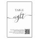 Elegante número da tabela de casamento de script branco preto, com código QR para procurar seus convidados para compartilhar suas fotos.