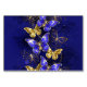 Composição de borboletas luxuosas de safira e joias de ouro em fundo azul texturizado.