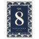 Este cartão de mesa de casamento elegante apresenta um sofisticado fundo azul-marinho emoldurado por padrões intrincados de conchas marinhas, criando um tema sereno e inspirado na náutica. O design apresenta um grande número "8" centralizado em branco crocante, com a palavra "mesa" escrita de forma elegante acima dele. Espaços personalizáveis para nomes e datas são apresentados em uma fonte sans-serif limpa, adicionando um toque moderno ao layout clássico. A paleta de cores harmoniosa e a composição equilibrada evocam sentimentos de tranquilidade e sofisticação, tornando-o perfeito para casamentos formais com tema de praia ou oceano.