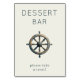 Este sinal de mesa de casamento apresenta um design limpo e minimalista com uma ilustração centralizada da roda do navio que adiciona um toque náutico. A paleta de cores é simples, usando tons de cinza e texto preto em um fundo branco para um visual elegante. Letras maiúsculas em negrito anunciam "DESSERT BAR" no topo, enquanto um convite amigável abaixo diz "por favor, pegue um doce!" em uma fonte menor. A representação realista, mas estilizada, da roda do navio cria um clima vintage, perfeito para criar uma atmosfera relaxada e convidativa em seu evento.