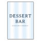 Este sinal de mesa de casamento apresenta um design limpo e minimalista com listras verticais em tons suaves de azul, criando uma atmosfera calmante e convidativa. A fonte serifada em negrito para "DESSERT BAR" é complementada por uma mensagem amigável sem serifa abaixo, encorajando os convidados a se deliciarem livremente. O layout simples enfatiza a clareza e a elegância, tornando-o perfeito para guiar os convidados aos doces da sua festa. Seu estilo moderno e paleta de cores suaves adicionam um toque de sofisticação, mantendo um clima casual ideal para qualquer estação de sobremesas.