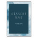 Este sinal de mesa de casamento apresenta um design moderno e minimalista com um fundo azul-marinho profundo e formas suaves semelhantes a nuvens em azul claro e branco em torno das bordas. A tipografia limpa e sem serifa exibe proeminentemente "DESSERT BAR" junto com a mensagem convidativa "PLEASE TAKE A TREAT!" criando uma atmosfera alegre e acolhedora. O layout é simples, mas elegante, tornando-o perfeito para guiar os convidados até a sua estação de sobremesas em qualquer celebração.