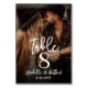 This custom table number sign features your photo as the background, creating a beautiful and personal detail for your reception tables. A subtle black gradient ensures the text remains clear and easy to read, with a mix of handwritten script and classic serif fonts for an elegant, balanced look. The design includes the table number, along with the bride and groom’s names and wedding date.