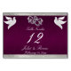 Esta design romântica apresenta um elegante fundo roxo com bordas de fita, corações e pombos vinculados a um lugar para o número da tabela, nomes de casais e data do evento. Disponível em várias cores para seu tema de casamento. (A fita é simulada na trabalho de arte). Concebido para coordenar com a Coleção Caseira "Dois Tornar-se-ão Um - Prateado e Dourado". Para alterar os detalhes, clique em "Personalizar". Para mover o texto ou alterar o tamanho, a fonte ou a cor do texto, clique em "Clique para personalizar mais".