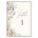 Cartão de número da mesa de casamento com flores elegantes em diferentes tons de azul empoeirado e creme.