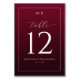 This elegant wedding table card features a deep burgundy background with crisp white text, creating a sophisticated and formal atmosphere. The design includes a combination of serif and script typography, adding a touch of modernity to the traditional layout. Customizable elements allow for personalization with names and dates, making it perfect for marking special moments at your event. The clean lines and structured composition ensure clarity and focus, ideal for enhancing the ambiance of any formal gathering.