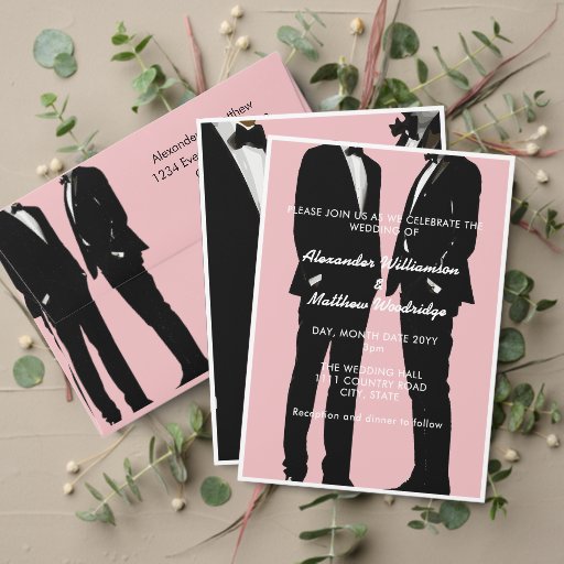Simple, modern and elegant. Two men confidently sporting timeless tuxedos translate a narrative of love and everlasting commitment. The timeless and stylish black and white palette is elegantly complemented by an understated calligraphy and a subtle light pink background. This design can be seamlessly applied to wedding essentials such as save-the-dates, wedding invitations, wedding programs, thank you cards, reception menus, custom wedding decor. For customization support, please email remidevandesigns@gmail.com RemideVan©